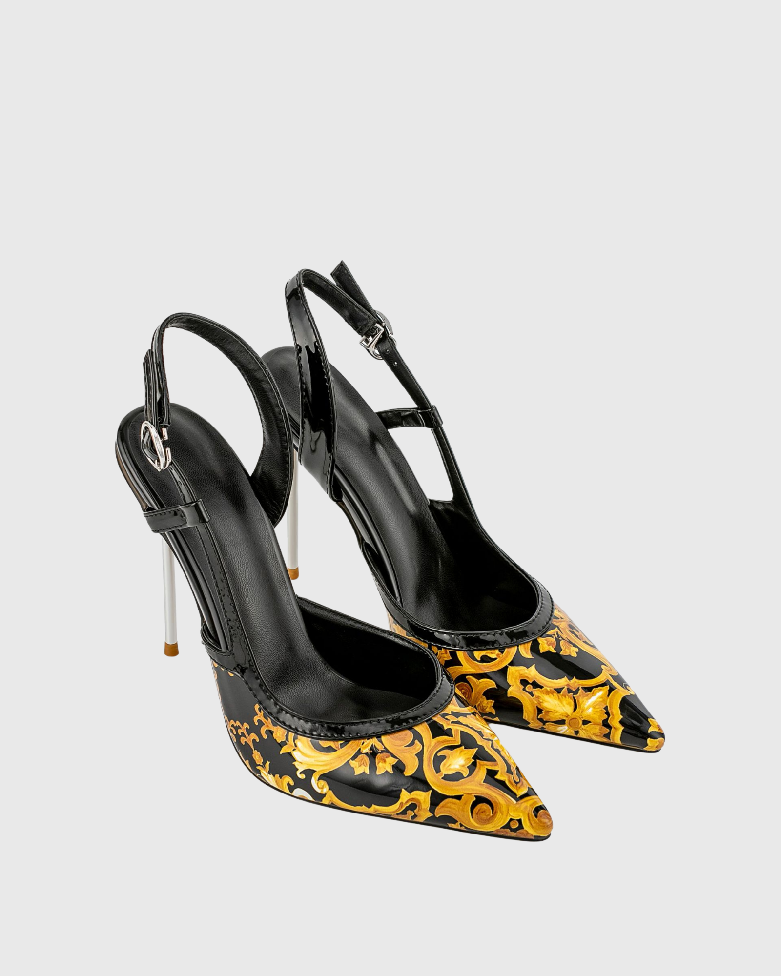Step into luxury with our Sloan Gold Print Slingback Pumps! These stunning pumps feature a sleek and chic design with a gold print that will elevate any outfit. The slingback style adds a touch of sophistication while also providing comfort and support for all-day wear. Make a statement and feel confident in every step with our Sloan pumps!