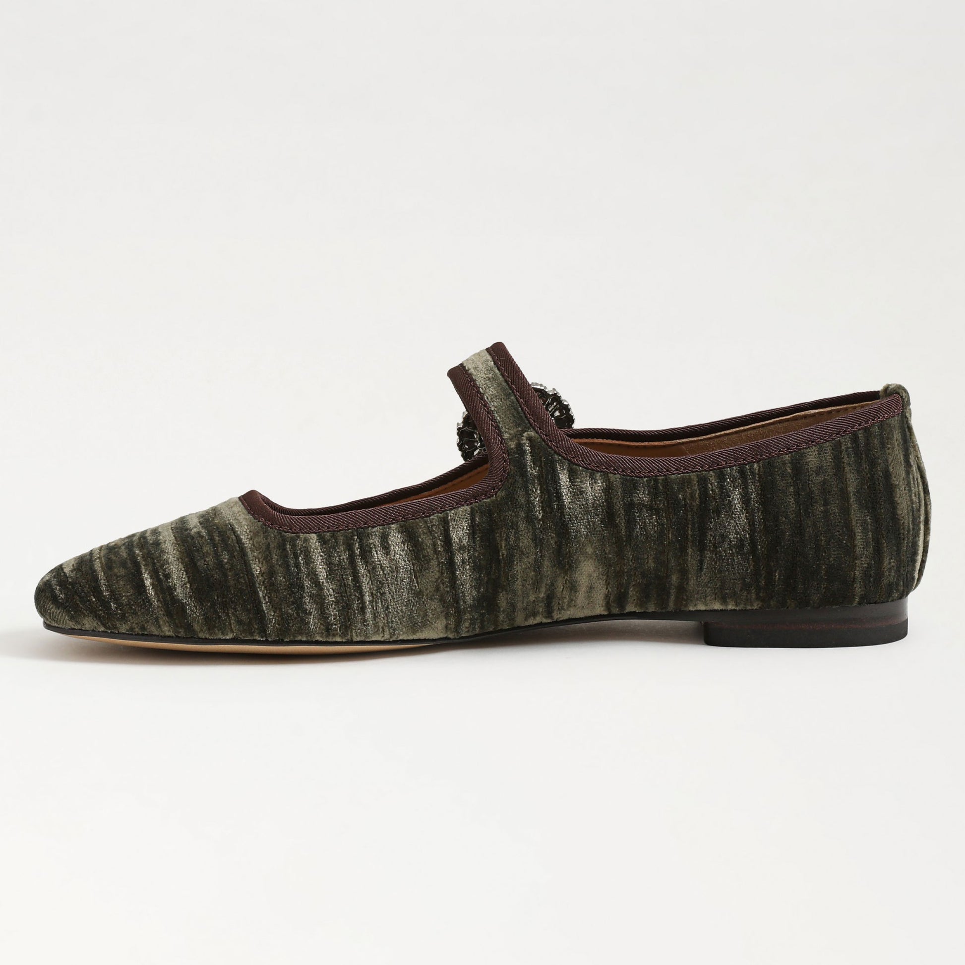 Velvet Square Toe Crystal Buckled Strap Mary Jane Flats in Dark Green