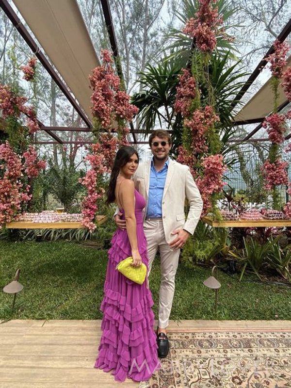 Vintage Fuchsia V-neck Spaghetti Strap A-Line Chiffon Prom Dress Party Dress Evening Dress TP4497
