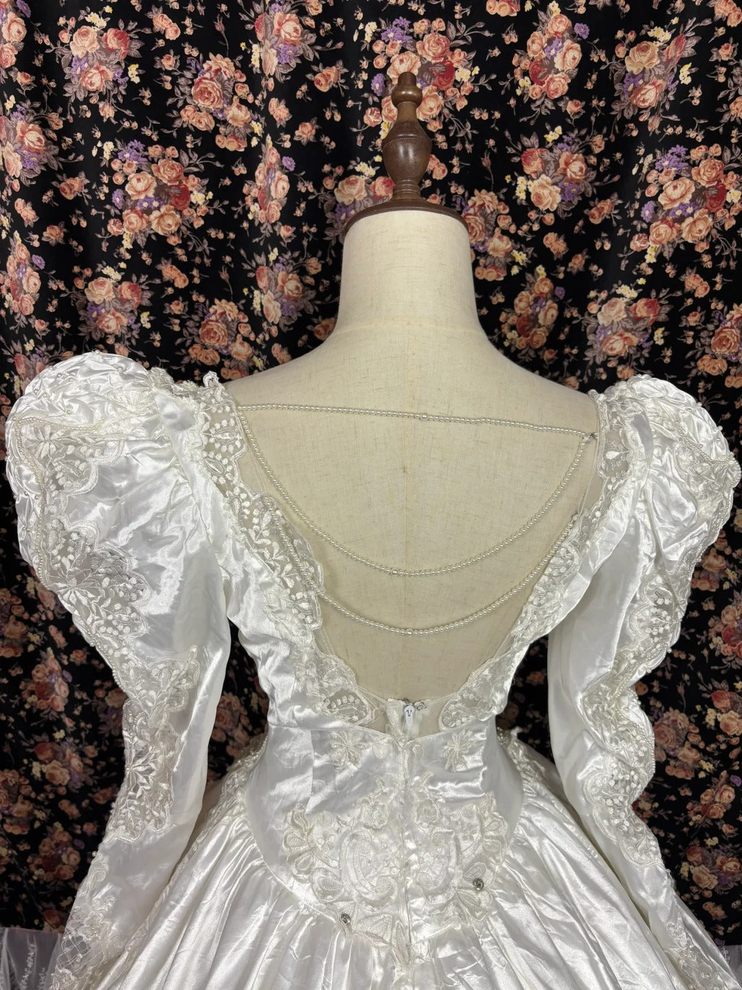 Vintage Leg of Mutton Sleeve V-Neck Pleated Ruffled Satin Floor-Length Wedding Dress P2992
