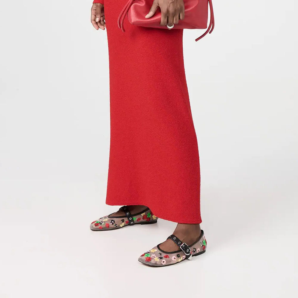 White mesh mary jane flats adorned with vibrant multi-color floral embroidery and a buckle strap, exuding charm and elegance for a stylish and feminine look.