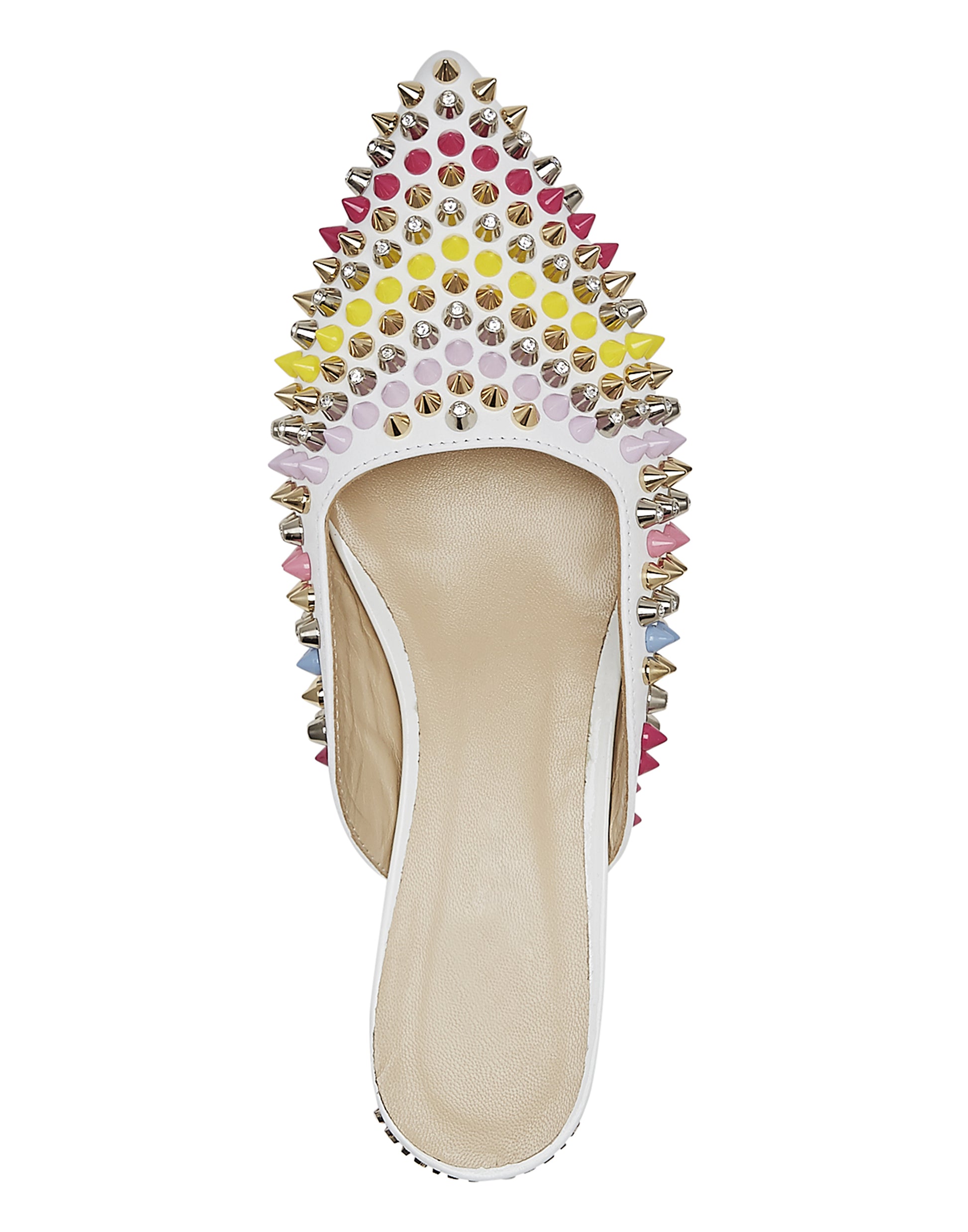 White Pointed Toe Flat Mules with Multicolor Rivets