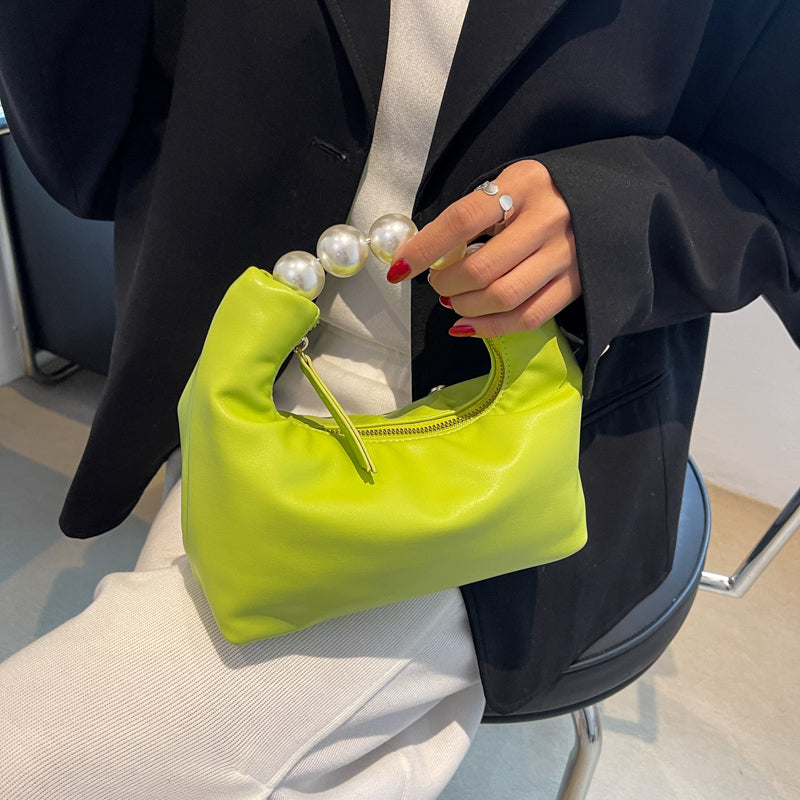 Women Chic Beaded Zipper Design Solid Color PU Handle Bag