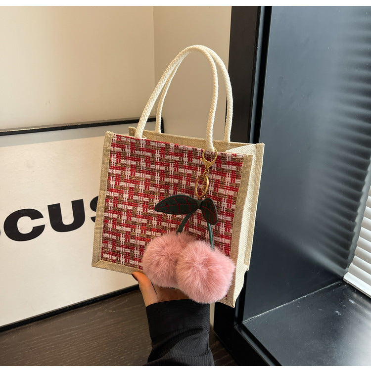 Women Fashion Casual Color Block Cherry Pendant Linen Tote Bag