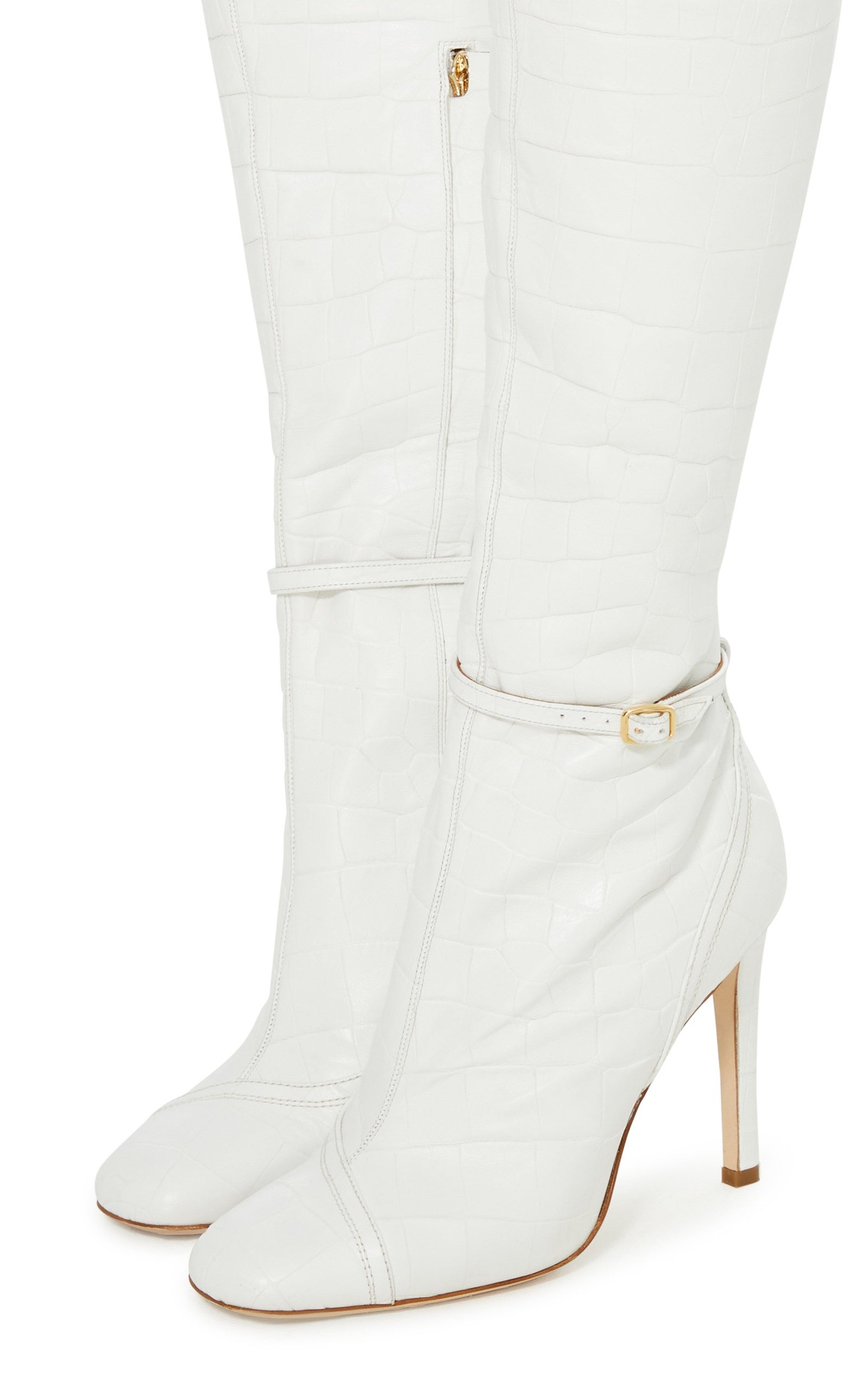 Elevate your style with these chic white croco-embossed boots featuring a square toe, knee-high design, and trendy buckle detail. Perfect for a fashionable statement outfit.