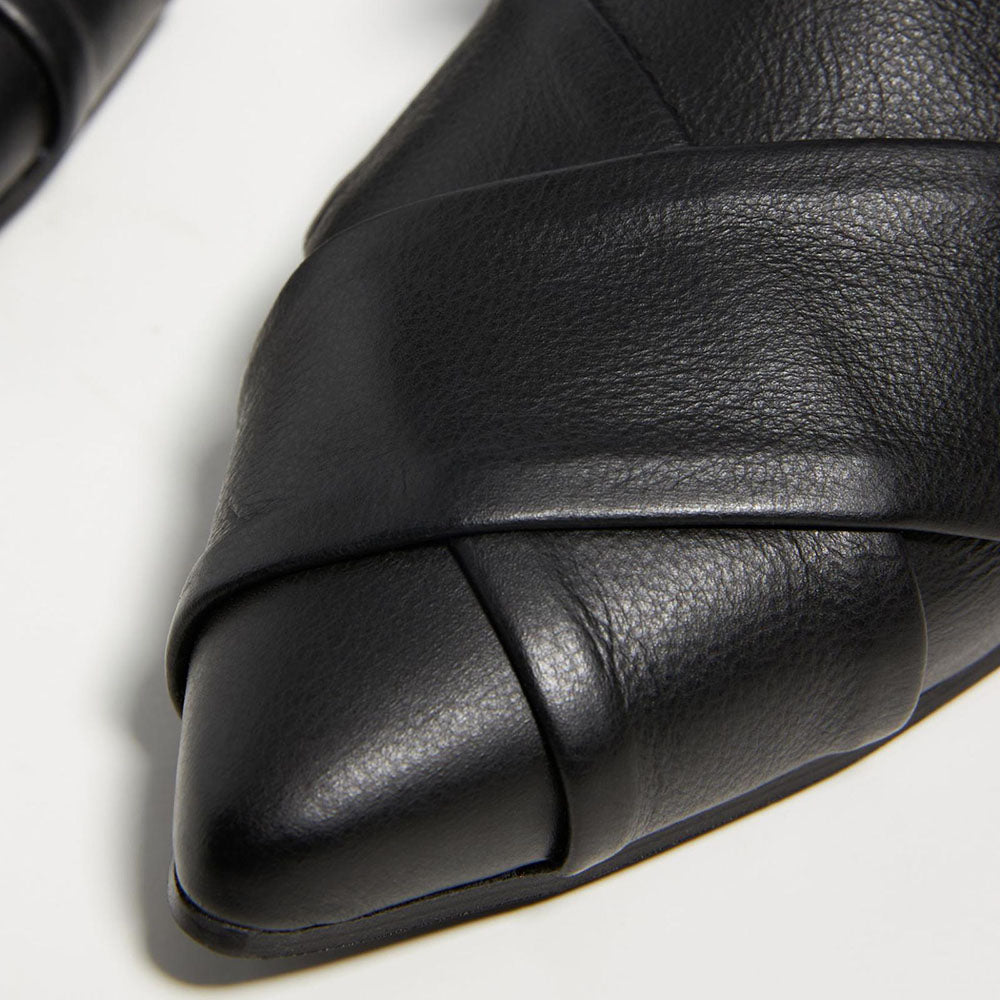 Introducing our Women's Black Pointy Toe Cross Strap Flat Mules with Bow Decor. These chic and versatile flats feature a stylish cross-strap design and a charming bow detail for added elegance.