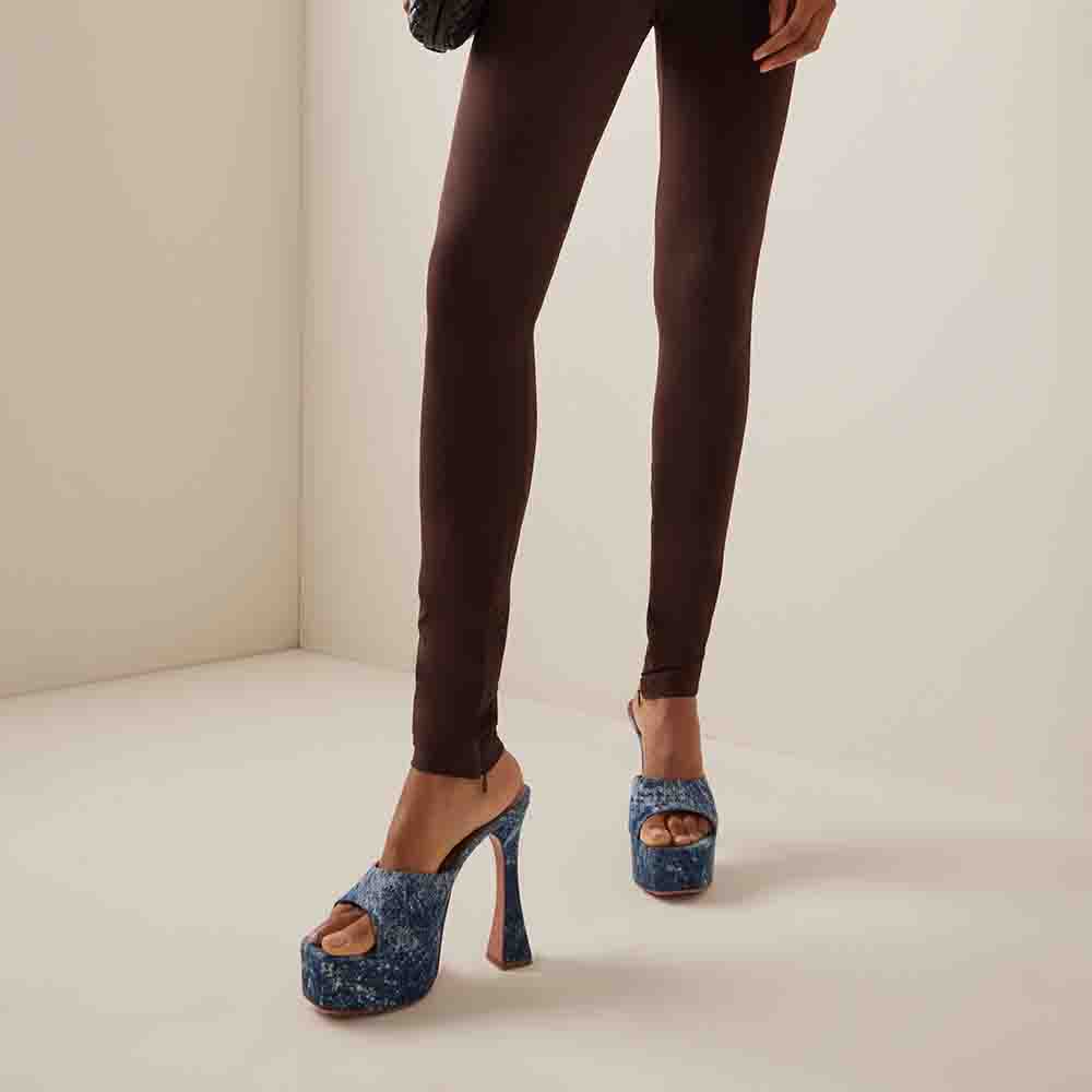 Women's Fashion Open Toe Flared Heels Blue Denim Platform Mules