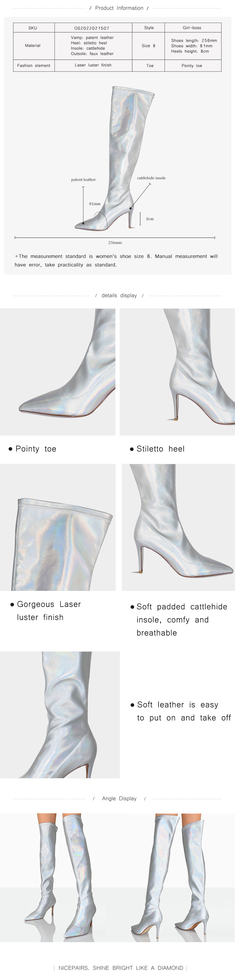 - Special Designs: Chic silver over-the-knee boots feature a holographic upper and wide calf design.