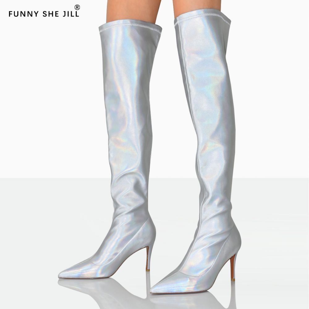 Women's Silver Pointed Toe Holographic Over-the-Knee High Heel Boots